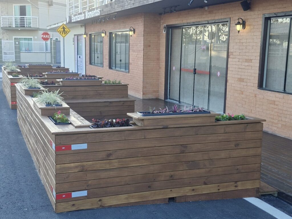 Estruturas foram instaladas em frente a um restaurante, transformando vagas de estacionamento em espaços de convivência.