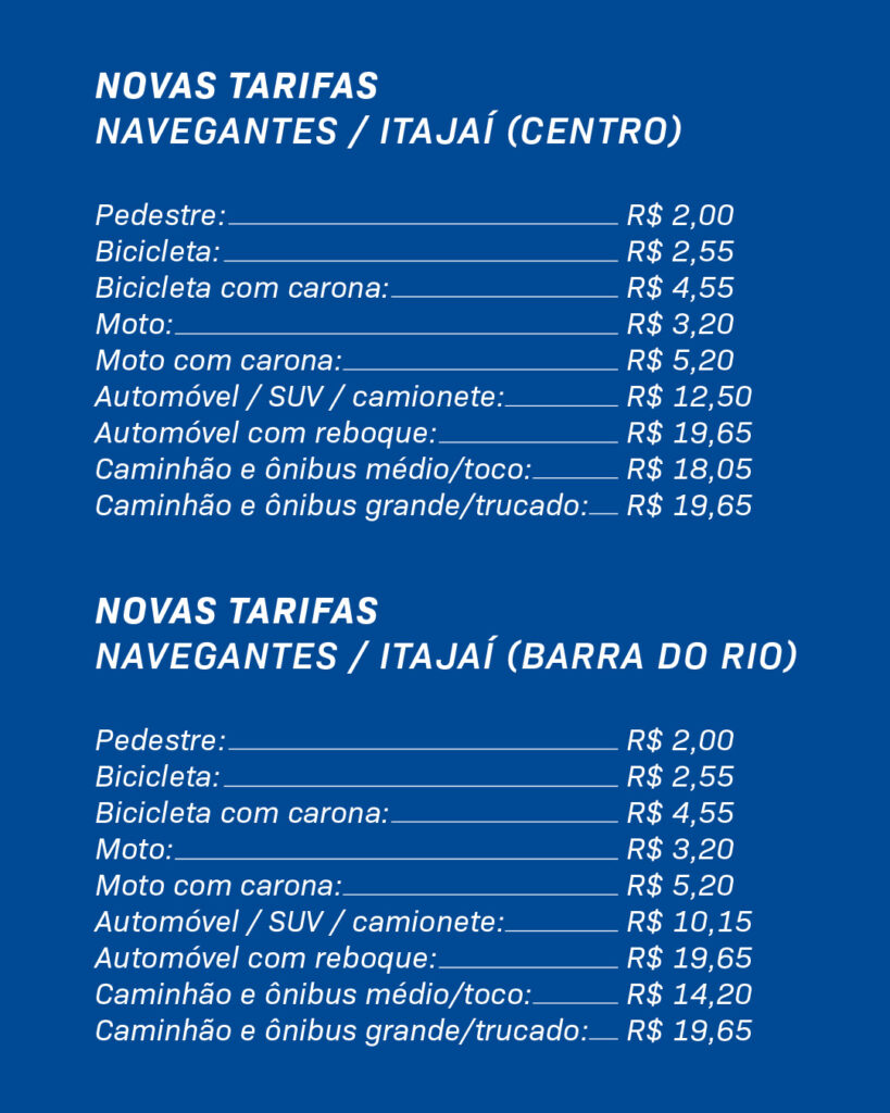 A empresa NGI Sul divulgou, em nota, que a partir de 11 de janeiro de 2026, irá implantar as novas tarifas no serviço de travessia entre Navegantes e Itajaí, conforme autorização da ARESC – Agência de Regulação de Serviços Públicos de Santa Catarina.