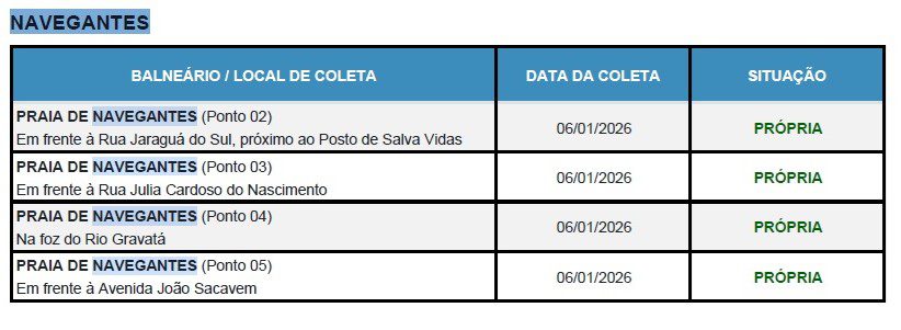 Na Praia de Navegantes, o relatório apontou que todos os pontos monitorados do Pontal ao Gravatá ao longo da orla, foram classificados como próprios para banho, conforme coletas realizadas em 06 de janeiro.
